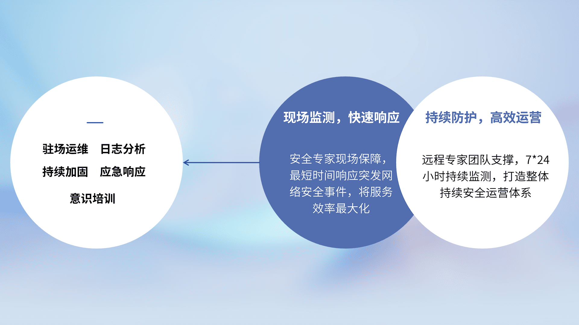 7X24小时持续监测安全事件,保持安全策略有效性,降低资产脆弱性风险,,精准拦截黑客攻击,,减少被黑客利用的机会,,,第一时间遏制,,,,降低损失。。